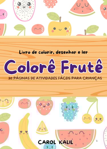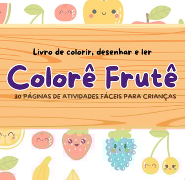 Livro de colorir com textos pequenos e informativos no tema FRUTAS.