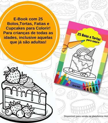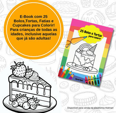 Livrinho terapêutico cheio de tortas, cupcakes, bolos, cheios de detalhes de glacê, frutinhas e bibelôs pra você pintar de todas as cores que quiser!